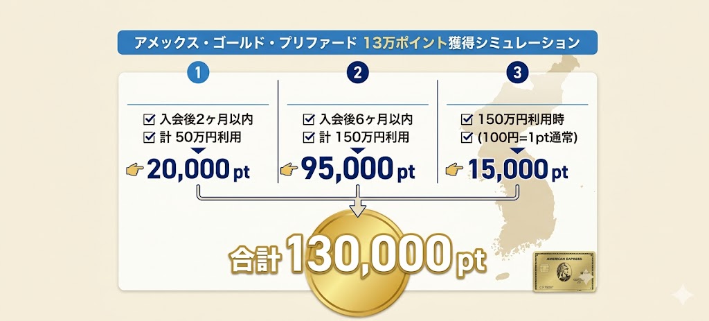 アメックス・ゴールド・プリファード(以下AGP)の年会費は39,600円。 主婦の感覚からすると、一瞬「……え?」と固まる金額ですよね(笑)。でも、実は入会後の条件を達成するだけで、合計13万ポイントも獲得できることに